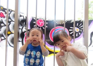 風が吹くと泳ぐこいのぼりに、びっくりしながらも”タッチ”をして楽しんだ子どもたちです。