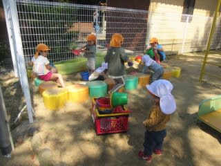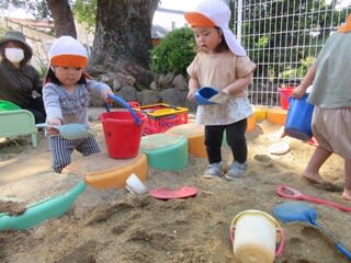 子どもたちは砂場に行って穴を掘ってみたり、バケツいっぱいに砂を入れて重さを体感したり・・・
