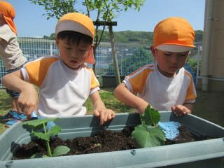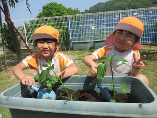 トマトやきゅうり、ピーマンなど子どもたちが一つ一つ丁寧に植えてくれました。
