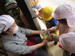 そんな中、なんと!卒園児と園児が走ってきて、スナップエンドウをいただきました。