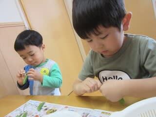 さっそくお部屋に入ると、保育士にすじ取りを教えてもらいながら