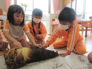 大きくて立派な筍。5歳児さんは皮むきを体験しました♫