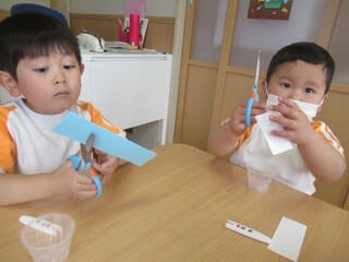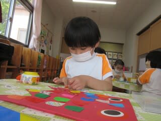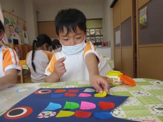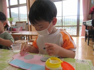 年齢に合わせて、絵の具を使ったり、ハサミやのりを使ったりと楽しく取り組んでいます(^^♪