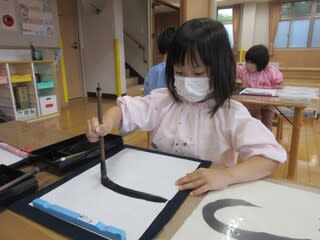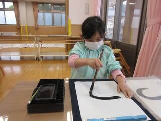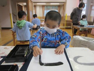 真新しい筆を持ち、ドキドキしながら取り組んでいるお友達。