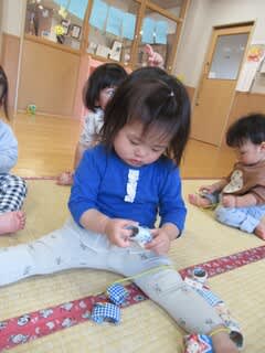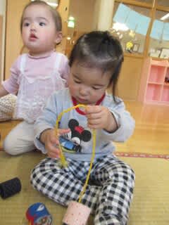 0歳児さんのお部屋をのぞくと、ひも通しで遊んでいました。