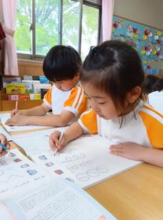 5歳児さんがが教材のワークに取り組んでいる様子です。