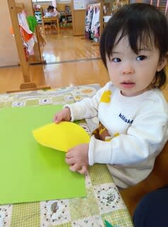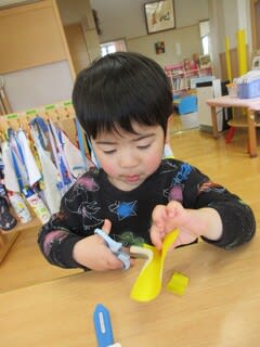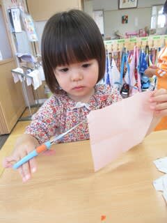 3歳児さんは、はさみを使って製作中。