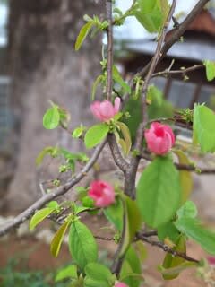 この木、カリンなのですが今まで実をつけたことがなくて、思わず筆で受粉らしいことをしてみました。さあ、実るでしょうか・・・?