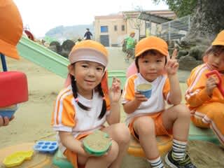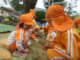 先日の砂場遊び(3歳児)の様子です。型を使って料理をしたり、落ち葉を使って山を作ったり、