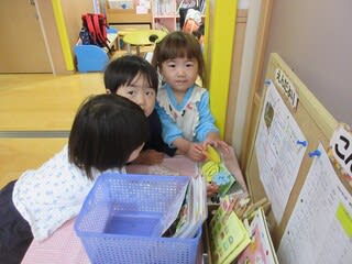 朝の準備時間です。小さいクラスのお友だちが大きいクラスのお友だちのところへ来ていました。