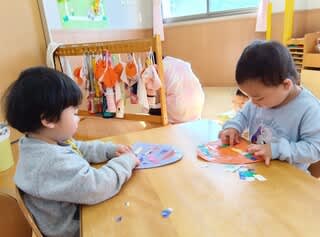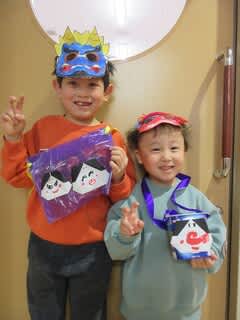 さて、春の節分の制作として、子どもたちは、鬼のお面や豆まきで使用する豆入れを作りました♩