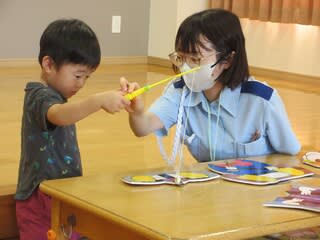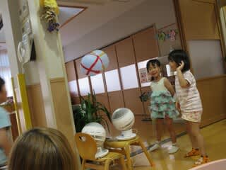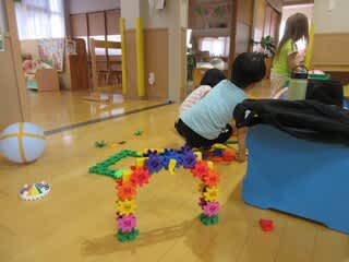 これを見ていた園児が、使っていた風船を持ってきて、もう一つ浮くかな・・・?と興味関心を持ち、2個の風船を一緒にどうにかして浮かせようとしていました。