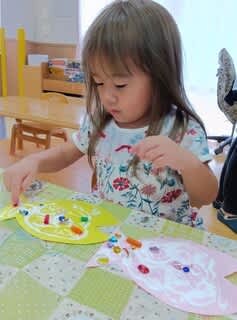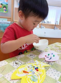 ストローやビーズ、おはじきなど思い思いの場所に飾りをくっつけて・・・