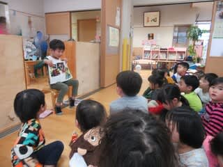 「さぁ、いまから絵本が始まるよ」というタイミングで前に出てきてくれたのは、4歳児のお友だち。