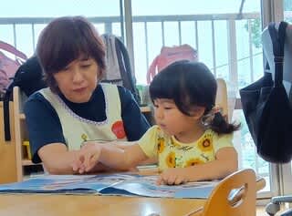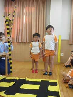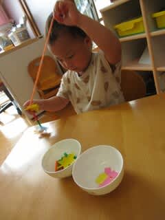 1・2歳児さんたちは、紐通しに挑戦しました!