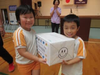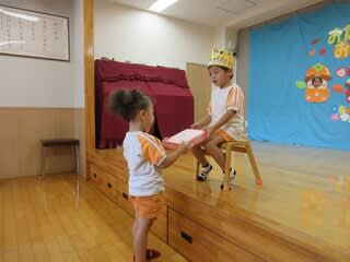 代表のお友だちからプレゼントを受け取り、うれしい気持ちでいっぱいの誕生会となりました。