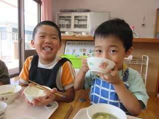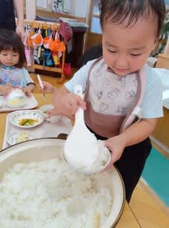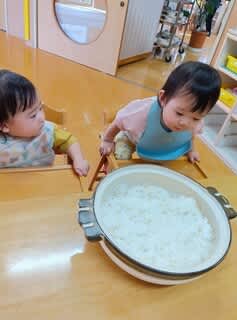 南串山町でとれた「新米」をいただきました。土鍋の蓋が開くと「わー✨」と覗き込む子ども達。自分たちで茶碗に装い、実食です(*^▽^*)