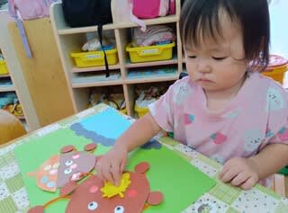 歌を歌いながら制作を楽しんでいる1・2歳児のお友だちです。