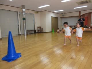 4、5歳児さんになると、お友達の速さや動きに合わせて走る経験もしました。
