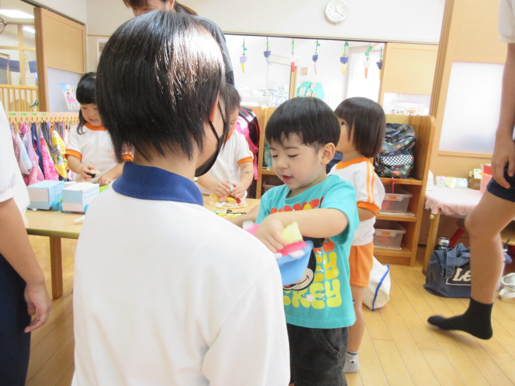 「お池にはまったよ~♪」「転がってるの💗」とお友達と話しながら楽しく取り組んだ製作の時間でした。