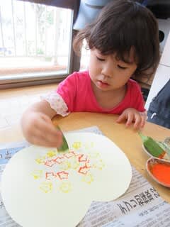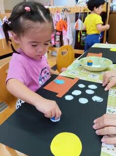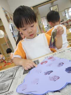 お友達と楽しく絵具スタンプをし、ぶどうやりんごの完成です