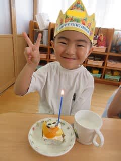 ケーキを前ににっこりのお友だち。みんなからの「おめでとう」の言葉にも素敵な笑顔で