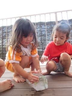 水に顔をつけてみたり、水をかけあったりと思い思いに遊ぶ様子が見られます。