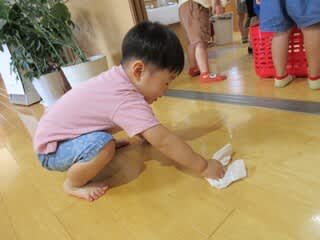 保育士や大きなお友だちの行動はしっかり見ていて、この日は、ちょっとお茶がこぼれている場所を発見した小さなお友だちは、