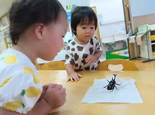 子どもたちが見つめる先には、大きなカブトムシ✨