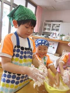材料を入れて、みんなでこねていきます。