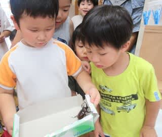 カブトムシを一目見ようと、触れようと、大喜びの子どもたちです