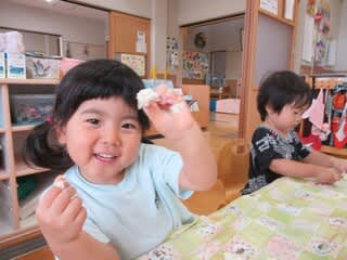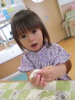 こねてこねて、手にくっつく感触を楽しんだり、ケーキや、おにぎりなど形を作ってみたり・・・