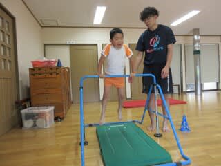 鉄棒やマットなどに触れ、いろんな器具を経験していきます。