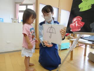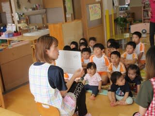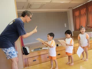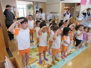 この日は地震についての避難訓練でした。紙芝居の後は、防災無線の音を使って臨場感のある状況。