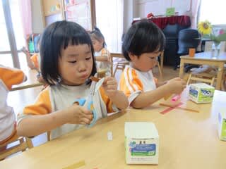 それから、はさみやのりを使って実際にヒマワリの花作りに挑戦です。