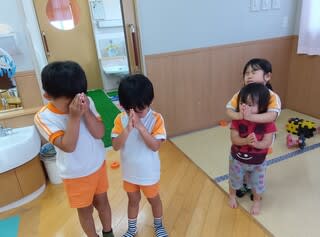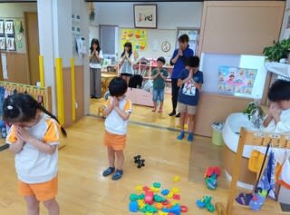 8月6日は広島原爆の日。8時15分のサイレンが鳴り、遊ぶ手を止め子どもたちも黙とうをして追悼しました。