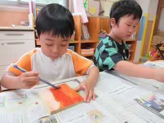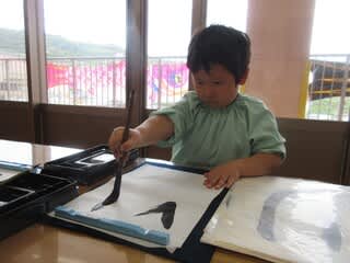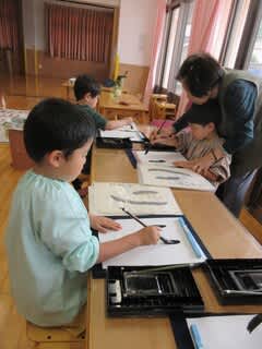 5歳児の習字の様子です。お手本をよく見て、先生の言葉をよく聞いて、取り組んでいます。