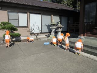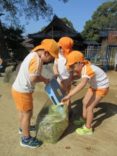 神社へお参りをした後は、みんなで落ち葉を集めて境内を掃除しました。