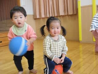 ボールに座ってバランスを取ったり、投げたり蹴ったりと身体を動かして遊びました♪