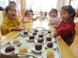 先日のおやつは、ぼたもちでした(^^)。3種類の中からお好みの物を選び食べました♩