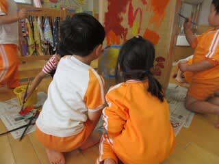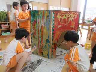 大きな段ボールの箱の色を塗っている子どもたち(^^♪