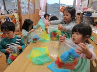 袋に、小麦粉と絵の具と水を入れてもみもみ(^^♪