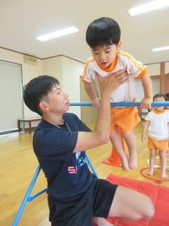 初めて鉄棒に挑戦した3歳児。「できた!」を目指して一緒に頑張りましょうね(*^^*)