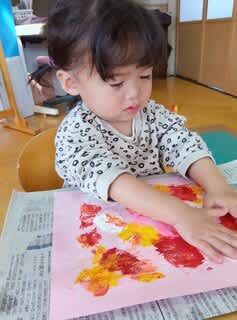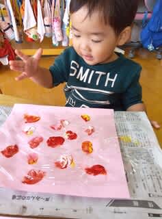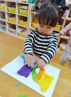 ラップの上から、絵の具の感触を楽しみ、一回触ると指が汚れていないか確認する子どもたちでしたが、