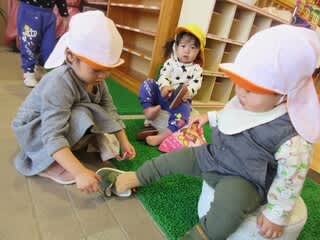 0歳児さんがお外へいく準備をしていると、