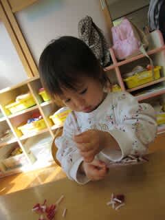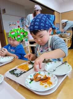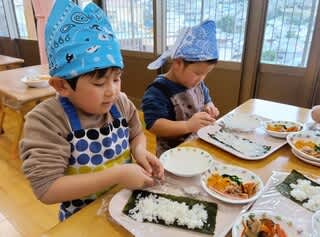 先日3、4歳児さんは恵方巻を作りました。
