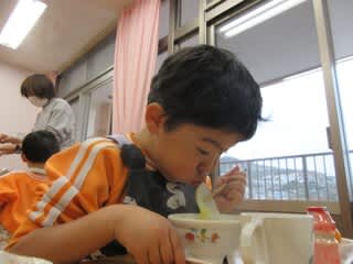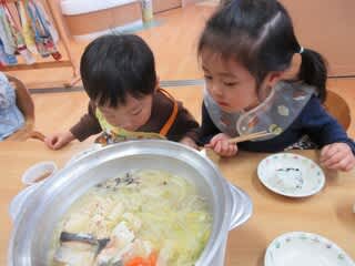 先日の給食の様子です。鮭の切り身が入った「石狩鍋」をみんなで食べました♩