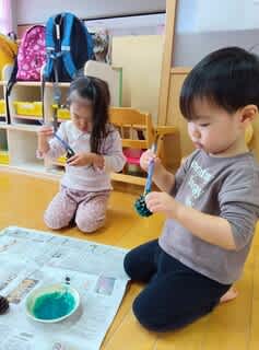 次は、どんな風に飾りつけをしようか、絵の具が乾くのが楽しみな子どもたちでした(^^♪