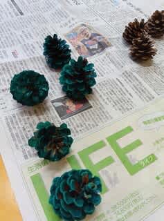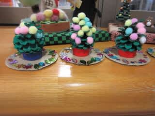 松ぼっくりを上に乗せると、とてもかわいいクリスマスツリーが完成しました