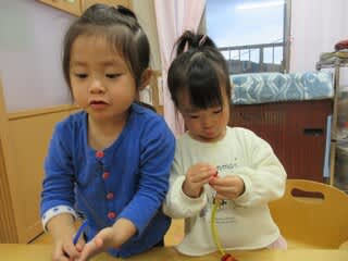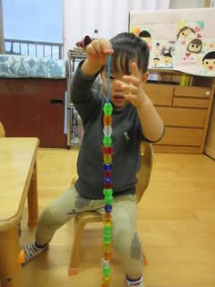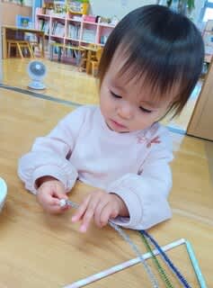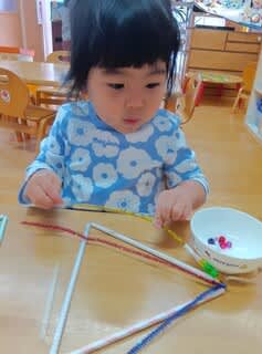 赤だけ、青だけと色別に通している子もいれば、形別に通していく子も💛
